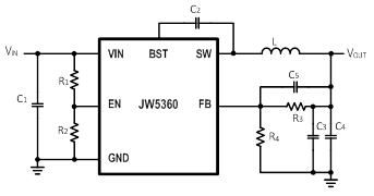 JW®5360 是一款基于 I2 架构的单片降压开关稳压器,可实现快速瞬态响应。 JW5360 在 4.5V~18V 的输入范围内工作,通过两个集成的 N 沟道 MOSFET 提供 2A 的连续输出电流。