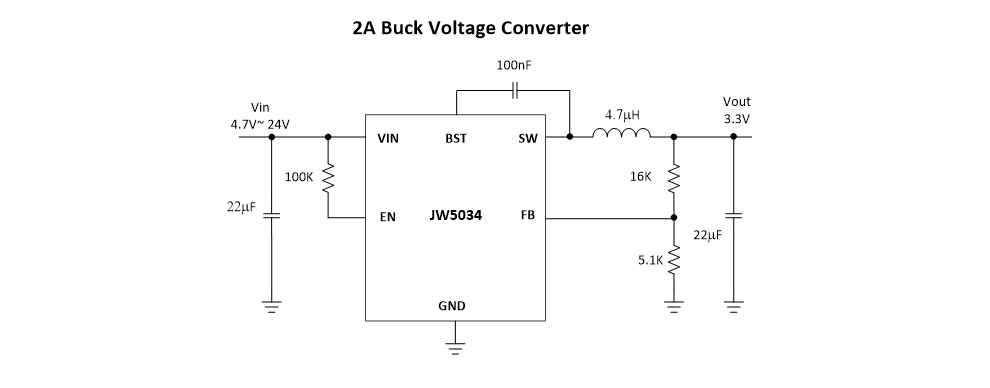 JW5034具有过流保护,热保护,启动电流失控保护和输入欠压锁定功能,可确保稳定性。