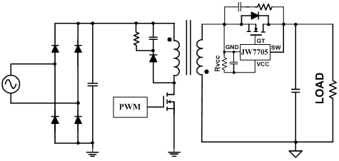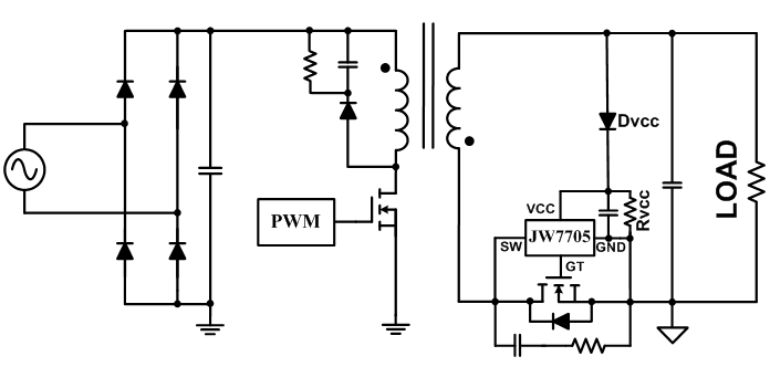 JW®7705 是一款支持反激式变换器同步整流控制器,带外置MOSFET的JW7705可代替高效率的肖特基二极管。如果VSW高于-300mV或者GND和SW之间的电流低于零,控制外置MOS的信号会关闭。