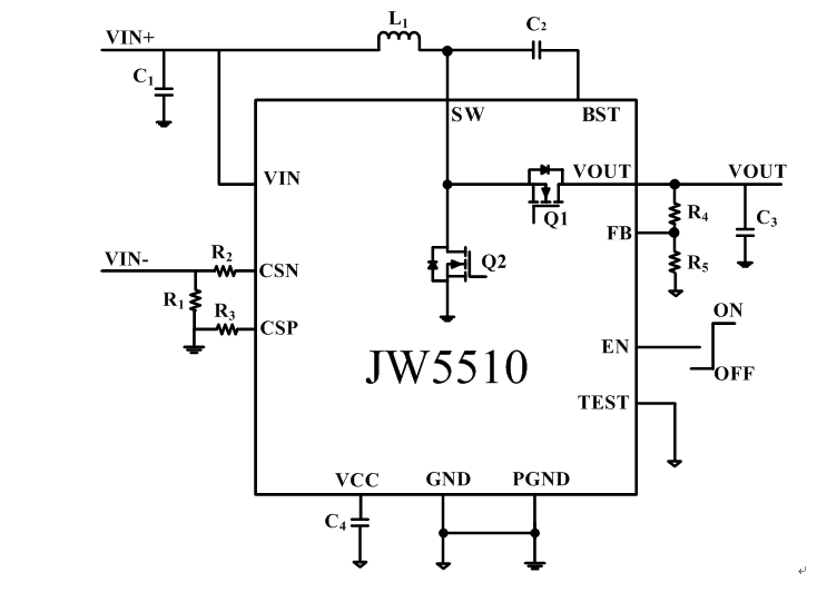 JW5510通过热保护和欠压锁定保证了坚固性。