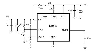 JW®7228 是高端保护控制器,JW7228在输入电压可能过低、过高甚至为负的这些应用中提供对 N 沟道 MOSFET 的智能控制。
