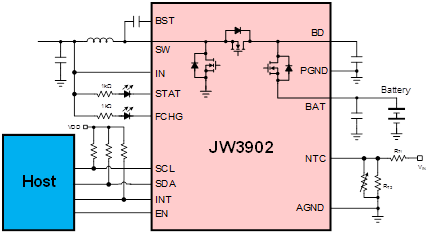 JW®3902 是一款高度集成的同步开关模式升压充电器,适用于 2 节或 3 节串联锂离子和锂聚合物电池。 JW3902提供完整的电池充电管理,包括预充电、恒流快充、恒压充电、充电终止和自动再充电。 该设备能够通过 5V 适配器或 USB 输入为电池充电。