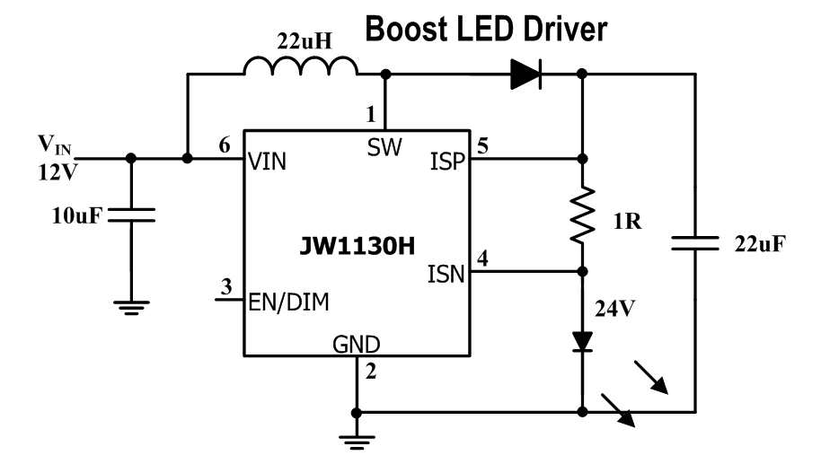 采用高压侧LED电流检测模式, JW1130H可以配置成Buck、boost、buck-boost拓扑以满足不同规格LED驱动的需要。