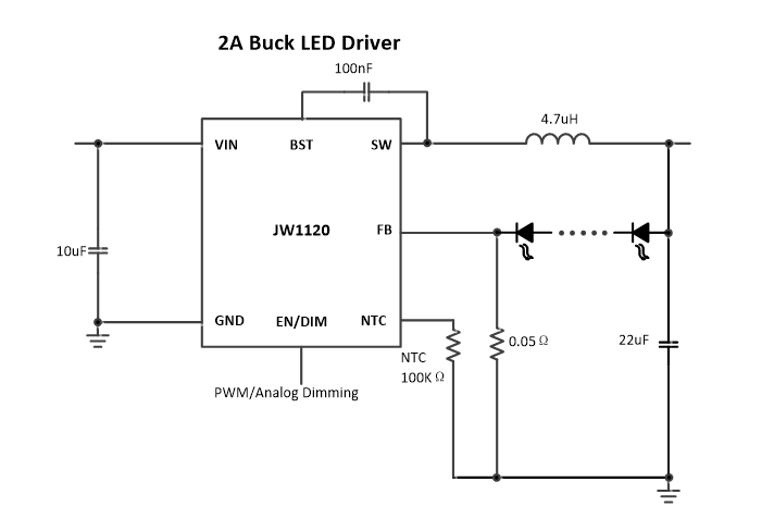 JW1120通过LED短路保护,热保护,启动电流失控保护,输入欠压锁定保证了稳定性。