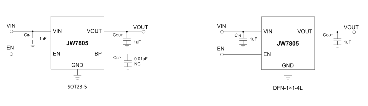 低静态电流低至6uA,几乎为零的禁用电流,是电池设备供电的理想选择。 JW7805的低输出噪声和高PSRR也对射频系统友好。