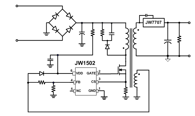 JW1502集成了欠压锁定(UVLO),VDD过压保护(VDD OVP),逐周期电流限制(OCP),短路保护(SLP),栅极钳位和VDD钳位等功能和保护。