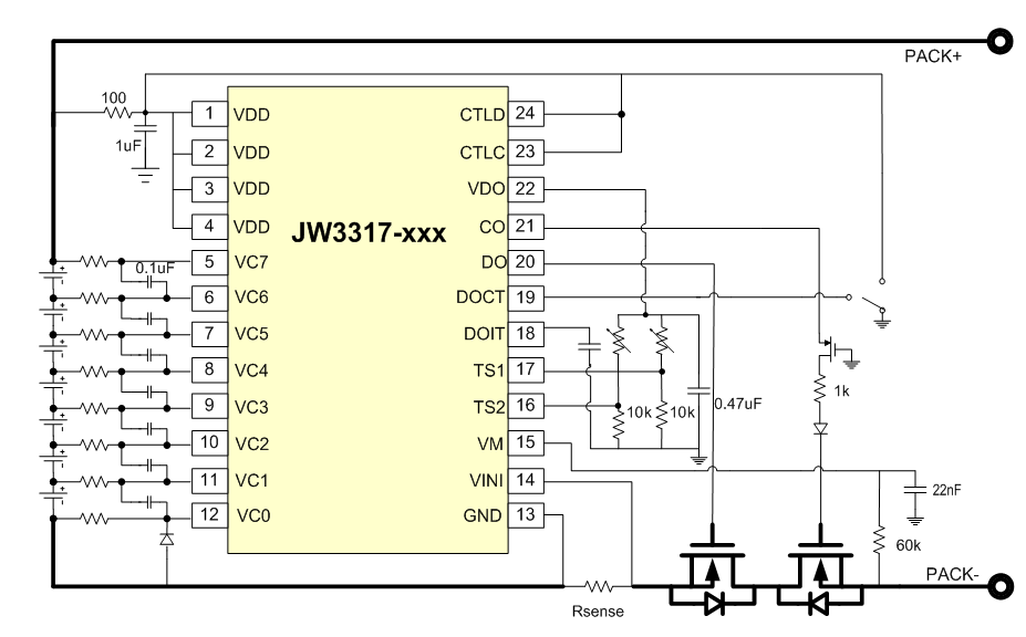 JW®3317 系列是专业的5/6/7 节可充电电池保护芯片,具有高集成度的特点,适用于电动工具,电动自行车以及UPS 后备电源等。JW3317通过检测各节电池的电压、充放电电流以及环境温度等信息实现电池过充、过放、放电过电流、短路、充电过电流、温度保护等保护功能,通过外置电容来调节放电过电流保护延时。JW3317 可以实现多个芯片级联,对8节或8 节以上电池包进行保护。