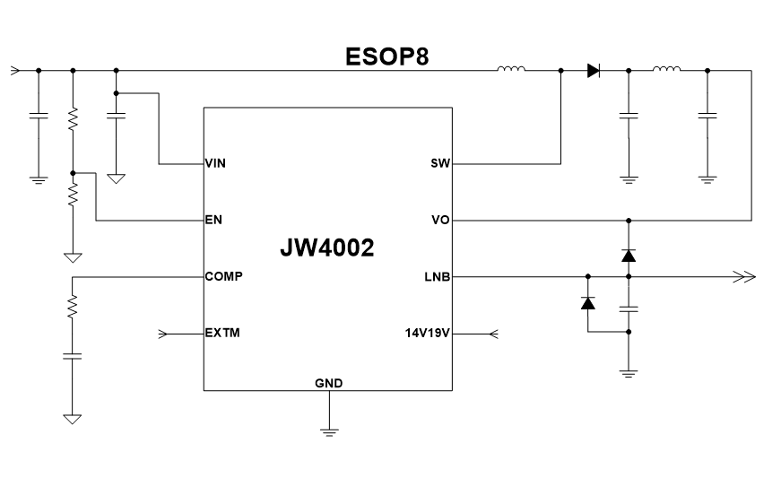 JW®4002是一款单晶片线性和开关稳压器,专门设计用于通过同轴电缆为卫星接收器的RF LNB(低噪声模块)转换器提供高效,低噪声的功率。